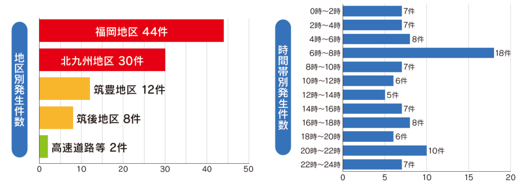 福岡県の飲酒運転事故は、かつて全国ワースト常連だった2000年代から年々減少を続け、23年は87件と、過去最少を更新しました。しかし、24年は96件(前年比+9件)と6年ぶりに増加へ転じ、25年も同じく96件と、過去最少更新の流れは、足踏み状態となっています。地区別にみると、福岡地区と北九州地区が突出しており、両地区だけで全体の77%を占めています。時間帯別にみると6時から8時の時間帯の事故が圧倒的に多く、早朝の通勤時間帯に集中しています。前日の深酒が原因で、本人が酔っていると自覚しないまま運転するケースが多いと思われます。