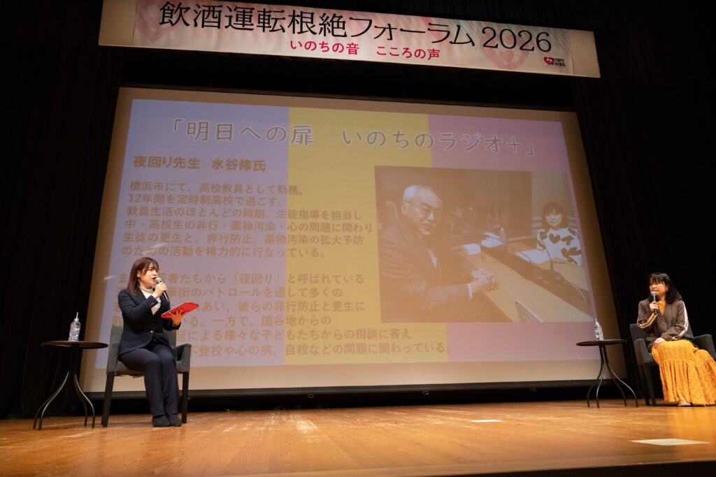 続いて山本寛大さんと同級生だった愛智さんと福岡市出身の川嶋さんが「いのちの音 こころの声」をテーマに対談しました。川嶋さんは、自身のラジオ番組にゲスト出演した“ 夜回り先生” こと水谷修氏の「大人が子どもたちの生きやすい環境や家庭、社会の空気感や道しるべを作らないといけない」という言葉を引用。「私たち大人の言動が子どもたちに影響を与えている。子どもたちにメッセージを伝えるためにまずは私自身が飲酒運転根絶という思いを深く心に刻み、周囲の大人たちと共有していきたい」と述べました。愛智さんはその言葉に大きくうなずき「いまだに福岡県内で飲酒運転がなくなっていないのは恥ずべきこと、引き続き飲酒運転ゼロに向け力を合わせていきましょう」と訴えました。